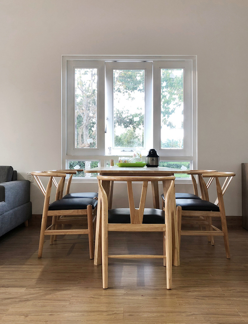 Bàn ăn bằng gỗ được đặt bên cửa sổ, giúp chủ nhà vừa tận hưởng những bữa ăn ngon vừa được dễ dàng ngắm nhìn thiên nhiên bên ngoài.