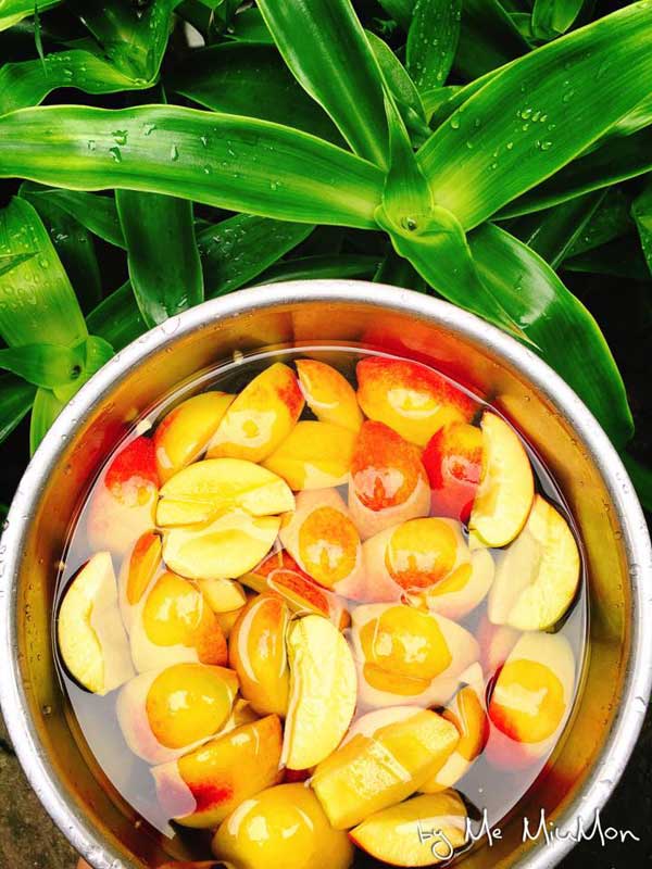 - Đào xanh muốn lên màu vàng đẹp như đào chín thì bạn thắng đường hơi vàng nâu, sau khi ngâm đào sẽ có màu vàng rất đẹp.