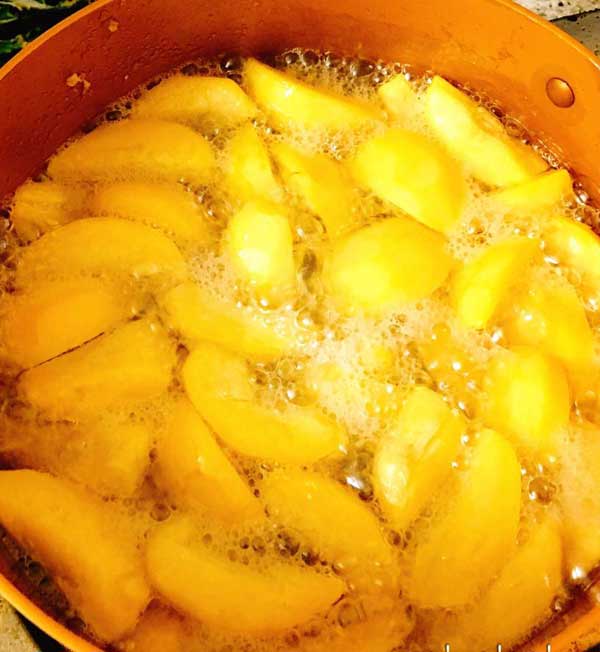 - Nước đường sôi thì cho đào vào đun sôi lại tầm 5phút thấy đào trong là được.