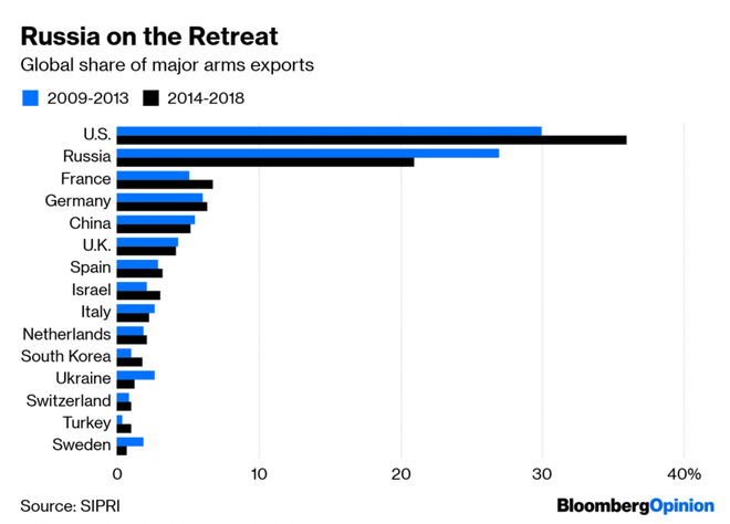 Bloomberg cho hay, doanh số bán vũ khí có lẽ phản ánh rơ ràng nhất ảnh hưởng quốc tế của các cường quốc quân sự. Thị trường vũ khí không chỉ có cạnh tranh về giá cả và chất lượng; mà đó c̣n là về mối quan hệ đồng minh lâu dài, đồng minh theo thời điểm.