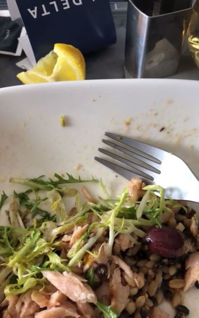 Hình ảnh một con giòi còn sống nguyên, bò lổm ngổm trên đĩa salad thuộc phần ăn phục vụ cho khách hạng thương gia của Delta Airlines