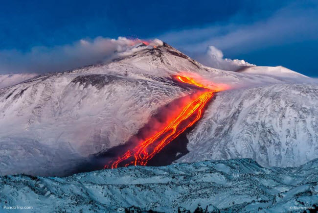 4. Núi Etna, Sicily: Nằm trên hòn đảo Sicily, Etna là ngọn núi lửa hoạt động mạnh nhất ở Italia. Nó thực sự nóng ngay cả vào mùa đông, khi đỉnh núi được bao phủ bởi tuyết lạnh giá. Đợt hoạt động mạnh gần đây nhất là vào năm 2017.
