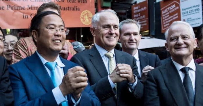 Tỷ phú Trung Quốc Hoàng Hướng Mặc (trái) đứng bên cạnh (cựu) Thủ tướng Úc Malcolm Turnbull tại lễ đón Tết Nguyên đán 2016. (Ảnh: Fairfax Media)