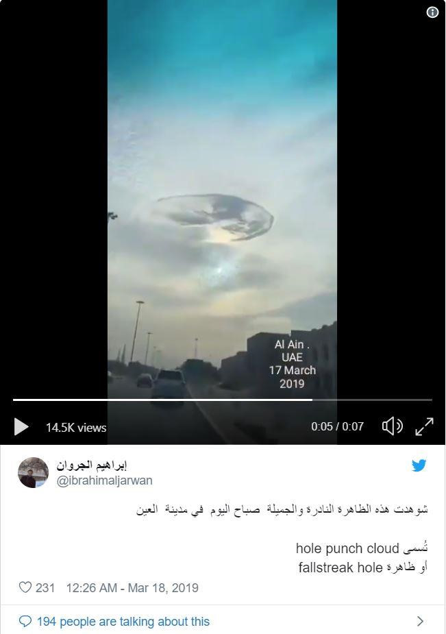 Hiện tượng "lỗ mây" được đăng tải trên Twitter ở UAE khiến nhiều người đồn đoán về UFO.