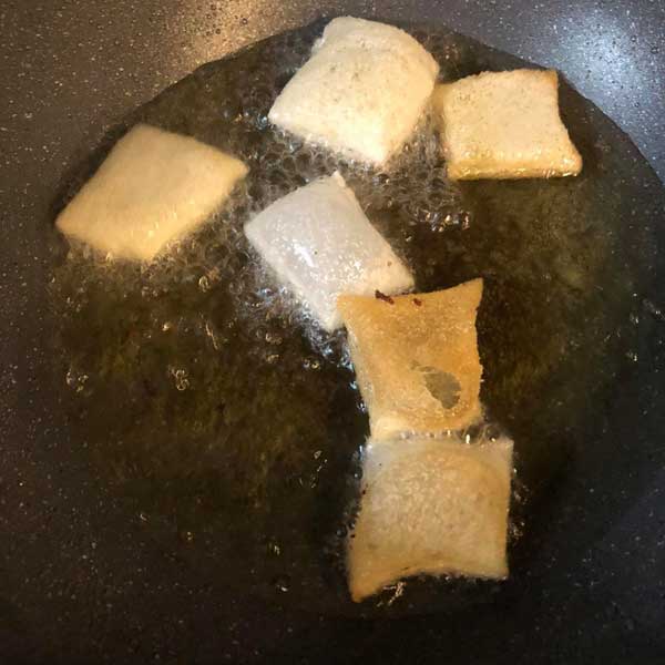 Bánh phở đem chiên trong chảo ngập dầu đến khi vàng, vớt ra giấy cho ráo dầu.