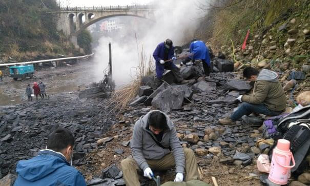 Các nhà cổ sinh vật học khai quật hóa thạch trên bờ sông Đan Thủy. Ảnh: Science/AAAS.