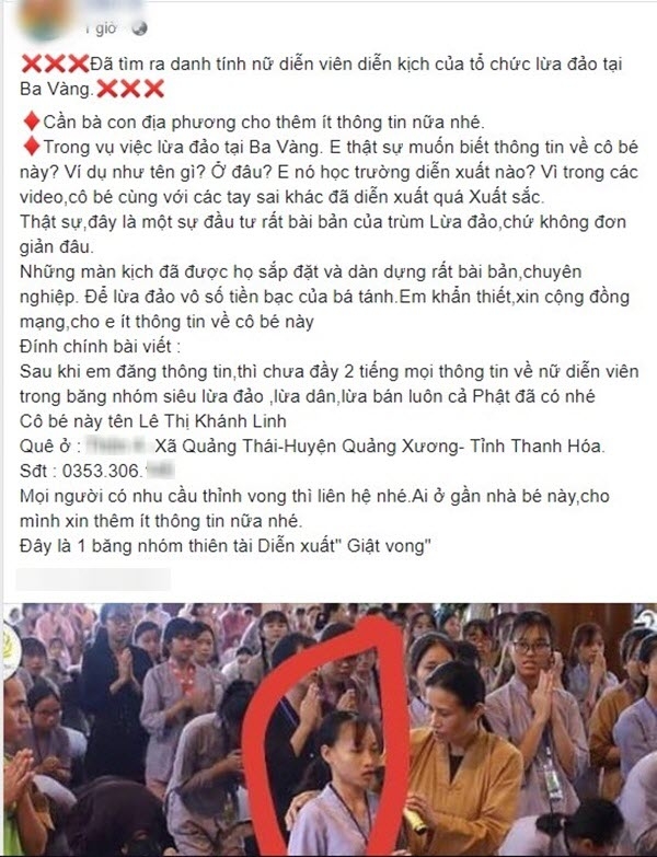 Giữa những lùm xùm về chùa Ba Vàng, cô Yến thỉnh vong giải nghiệp. Cộng đồng mạng đang lan truyền danh tính và địa chỉ cô gái Thanh Hoá lừa đảo. Cô gái này được cho là giả vờ bị vong nhập trong chùa Ba Vàng, là thành viên trong hội nhóm lừa đảo của bà Phạm Thị Yến.