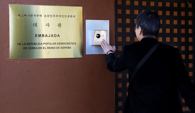 Một nhà báo Hàn Quốc xuất hiện tại đại sứ quán Triều Tiên ở Madrid, Tây Ban Nha (Ảnh: Reuters)