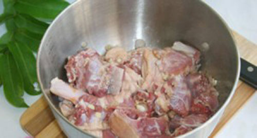 Cho sấu vào nồi, đổ nước cho ngập thịt. Các bạn có thể thay nước lạnh bằng nước dừa tươi để tăng vị đậm đà cho món vịt om sấu nhé.