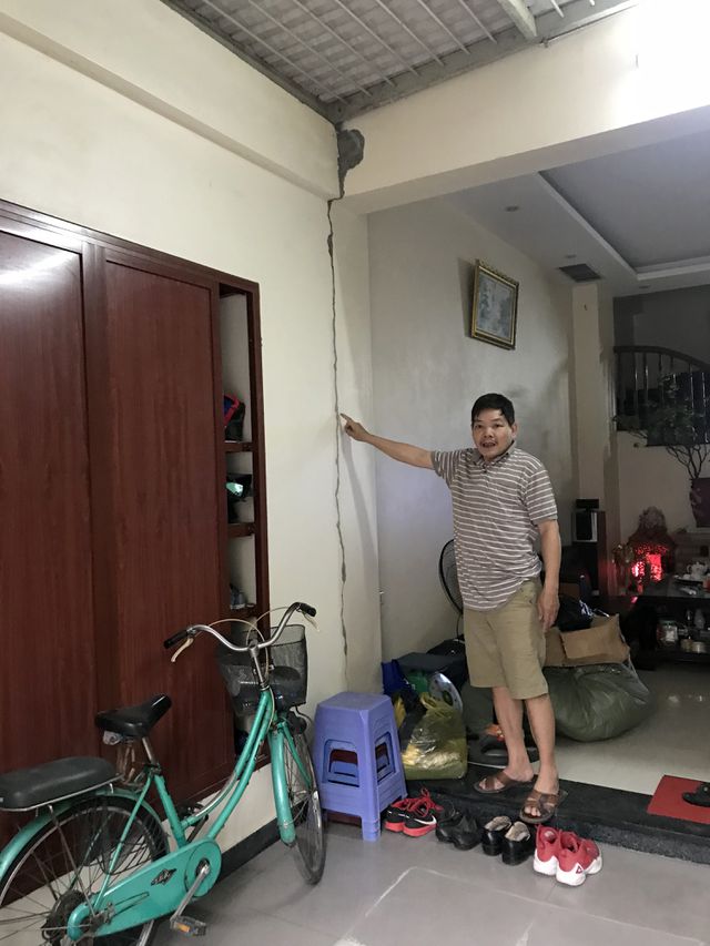 Bể nước nhà ông Phạm Đình Bưởi bị lún sân hơn 1 gang bàn tay người lớn, phần nền nhà tách hẳn so với bể nước. Ông Bưởi cho biết "Chả biết khi nào thì nó sập nữa, nếu mà sập cái thì chắc cả nhà tôi cũng bị vùi luôn".