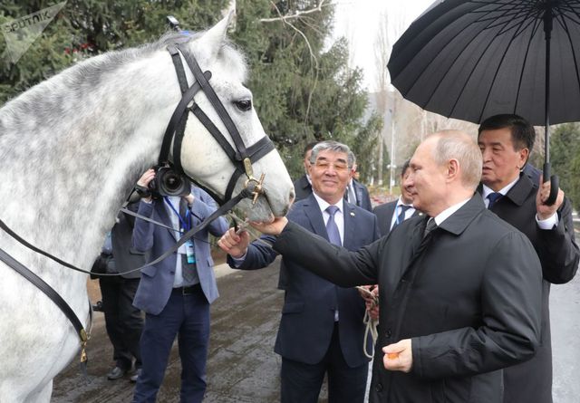 Tổng thống Putin chụp ảnh cùng ngựa nước kiệu Orlov nổi tiếng. Đây là món quà mà Tổng thống Kyrgyzstan Sooronbay Jeenbekov tặng ông Putin hôm 28/3 vừa qua.