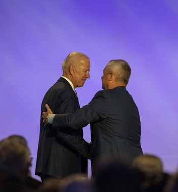 Joe Biden (trái) và Lonnie Stephenson tại sự kiện của công đoàn điện tại Washington ngày 5/4. Ảnh: AFP.