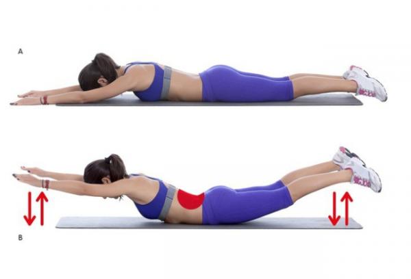 Nằm sấp, duỗi thẳng tay và chân, nâng tay chân lên cao và giữ yên trong 20 giây, lặp lại 3 lần, nghỉ 20-30 giây.