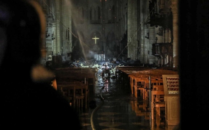Lính cứu hỏa đưa vòi nước chữa cháy vào trong nhà thờ để dập tắt đám cháy còn âm ỉ và giảm nhiệt cho các cấu trúc bên trong công trình.