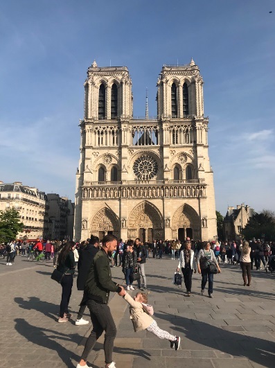 Cha con đang vui chơi bên ngoài nhà thờ Đức Bà không lâu trước khi xảy ra hỏa hoạn đã nhanh chóng lan truyền trên mạng xã hội, đã được chụp bức ảnh này khoảng một tiếng trước khi ngọn lửa bao trùm khắp nhà thờ với mong muốn tìm lại họ.
