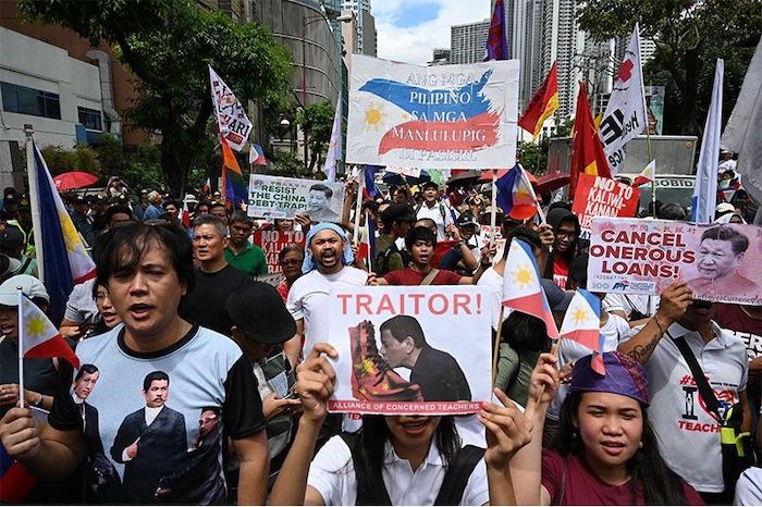 Theo Philstar, những người Philippines biểu tình chống Trung Quốc giơ cao tấm ảnh bức chân dung của Tổng thống Philippine Rodrigo Duterte hôn một chiếc ủng có trang trí cờ sao Trung Quốc, trong một cuộc biểu tình trước văn phòng lãnh sự quán Trung Quốc tại khu tài chính Manila hôm 9/4/2019. Những người biểu tình đã phản đối sự gia tăng hiện diện của Trung Quốc tại Philippines ở khu vực Biển Đông đang tranh chấp. (Ảnh: AFP/Ted Aljibe)