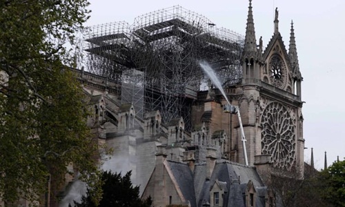 Lính cứu hỏa phun nước dập tắt đám cháy tại Nhà thờ Đức Bà Paris ngày 16/4.