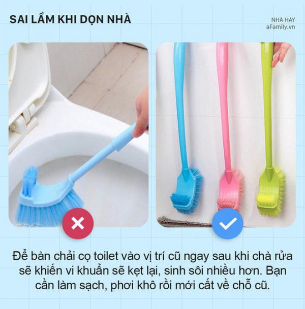 Nếu đặt bàn chải cọ toilet hay dụng cụ làm sạch như chổi, miếng bọt biển, khăn... vào vị trí cũ ngay sau khi chà rửa thì vi khuẩn sẽ kẹt lại trong lông bàn chải.