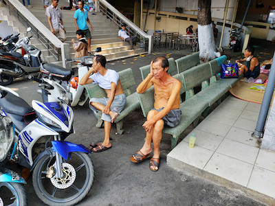Nhiều bệnh nhân trong Bệnh viện Ung Bướu (Q.Bình Thạnh) phải ra các ghế đá trên sân hoặc trải chiếu ở các hành lang để ngồi, nằm tránh cái nóng khó thở trong phòng