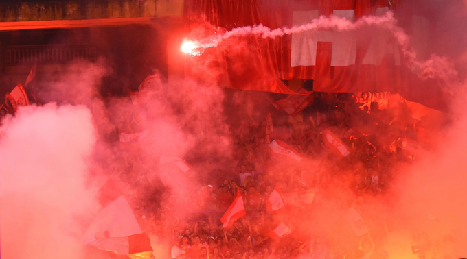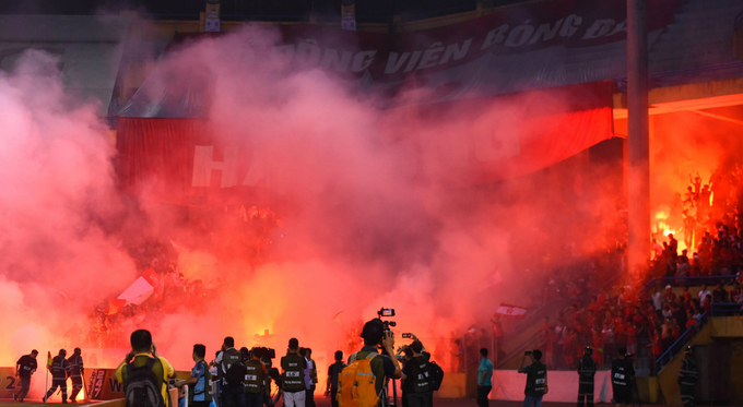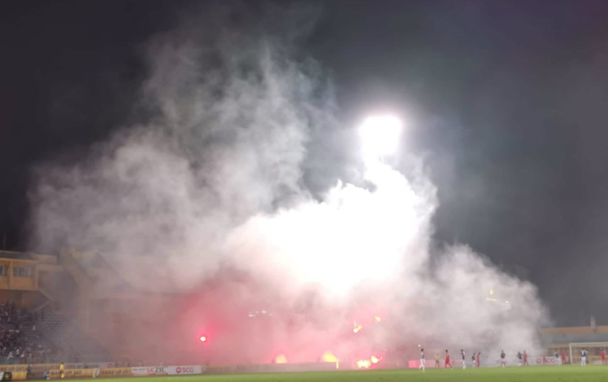 Khói pháo đặc quánh, bao phủ cả một vùng, khiến cầu thủ hai đội không thể thi đấu. Trọng tài Ngô Duy Lân phải cho trận đấu tạm dừng.