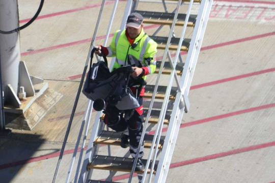 Nhân viên mặt đất tại Sân bay Quốc tế Perth đem chiếc xe đẩy ra khỏi máy bay. Ảnh: ABC