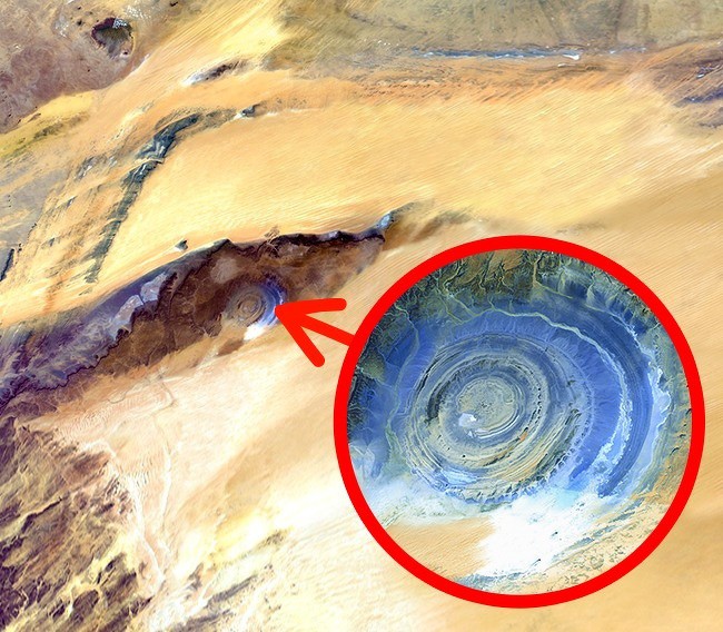 Con mắt có tên chính thức là Cấu trúc Richat, kích thước lớn đến nỗi các Phi Hành Gia còn dùng nó để định hướng. Dù trông như một cú va chạm của thiên thạch với Trái Đất nhưng thực ra con mắt của Châu Phi lại là kết quả của sự sói mòn.