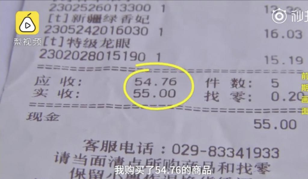 Hóa đơn siêu thị ghi rõ số tiền phải trả là 54,76 tệ, trong khi ông Xiao đưa tổng cộng 55 tệ.