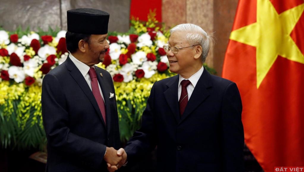 Tổng bí thư Việt Nam Nguyễn Phú Trọng tiếp quốc vương Brunei Hassanal Bolkiah tại Hà Nội ngày 27/03/2019.