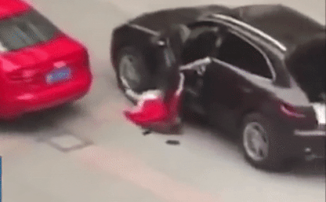 Đoạn video trên cho thấy, trong bãi đỗ xe của nhà trường, một nam thanh niên ngồi trong xe ô tô Porsche màu đen đang cãi nhau với một cô gái mặc áo đỏ ngồi trên mặt đất nhưng chân vẫn để bên trong xe ô tô, một tay nắm cánh cửa xe.