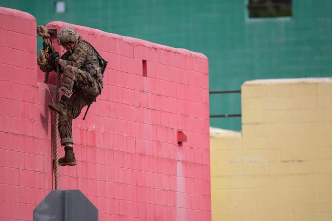 Một biệt kích thực hành nội dung vượt chướng ngại vật bằng dây thừng trong phần thi tác chiến đô thị.
