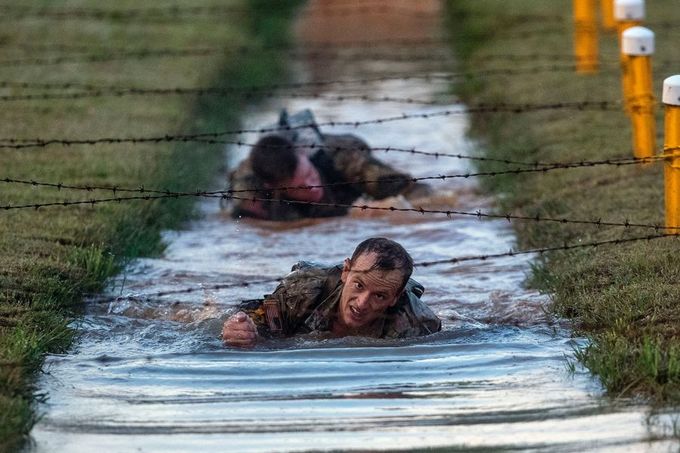 Đại úy Michael Rose bò dọc mương nước, phía trên là hàng rào dây thép gai trong nội dung vượt chướng ngại vật. Phía sau đại úy Rose là đồng đội John Bergman trong cặp thi số 10.