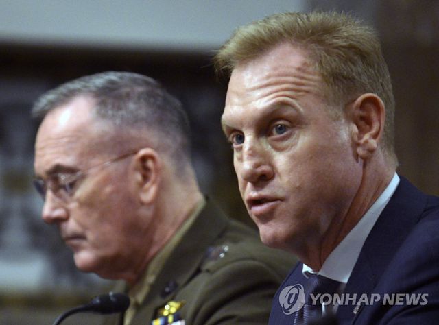 Quyền Bộ trưởng Quốc phòng Mỹ Patrick Shanahan (phải) và Chủ tịch Hội đồng Tham mưu trưởng Liên quân Mỹ Joe Dunford tại phiên điều trần (Ảnh: Yonhap)