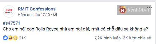 RMIT luôn được biết đến là trường cho ' con nhà giàu' nhưng đi Rolls Royce đi học thì tật sự là quá sưc tưởng tượng .Dù chưa có thông tin nào xác nhận M.H là người đăng confession kia nhưng giữa M.H và chủ nhân của câu hỏi gây sức có những nét tương đồng đáng chú ý. Ẩn danh khi đăng tin nên dân mạng cũng rát tò mò về người hỏi kia và đã tìm đc M.H.
