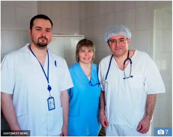 Đội hồi sức cấp cứu, từ trái sang phải: bác sĩ Dmitry Krivkov, y tá Irina Rymsha, bác sĩ Dmitry Mitsukov. Ảnh The Sun.