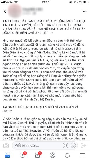 Mới nhất, nhiều người đã chia sẻ rộng rãi thông tin về vụ sát hại nữ sinh giao gà. Theo đó, nguồn tin này cho hay kẻ chủ mưu là một thiếu úy công an. Tuy nhiên, sự thật sau đó đã được công an tỉnh Thái Nguyên xác nhận là không đúng.