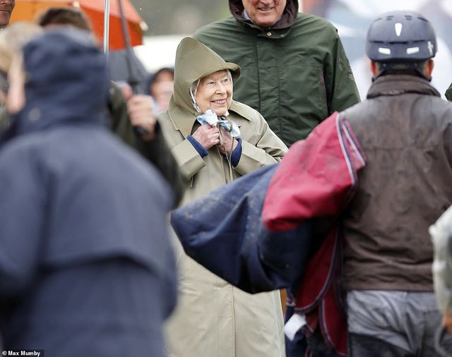 Nữ hoàng nở nụ cười hạnh phúc đội mưa đi gặp chắt trai mới sinh. (Ảnh: Max Mumby)