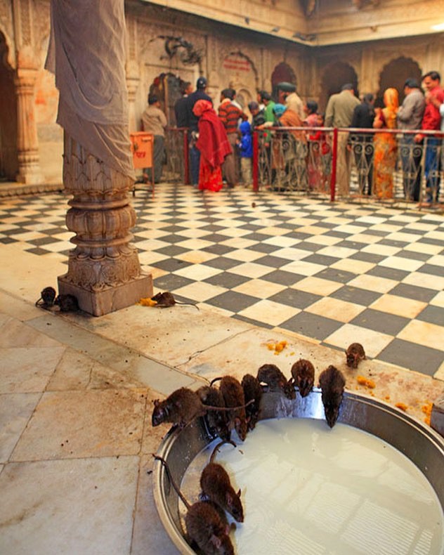 Đền Karni Mata ở Ấn Độ coi chuột là loài vật linh thiêng, họ cho chúng ăn uống thỏa thích thay vì đuổi đánh