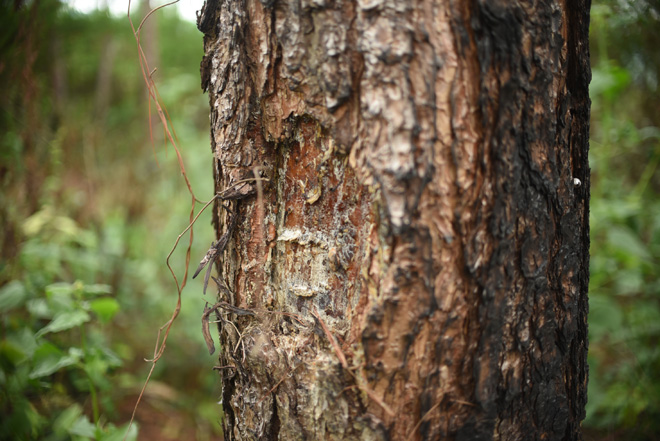 Kẻ gian đã dùng khoan máy, khoan vào thân rồi đổ chất độc vào bên trong khiến nhựa thông ứa ra và cây chết dần.
