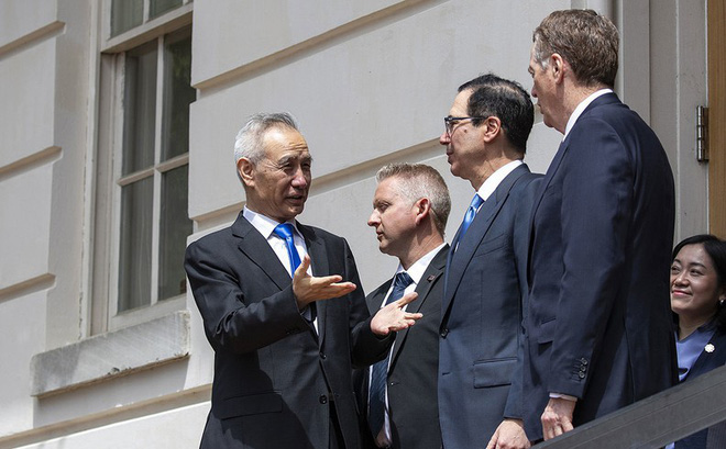 Phó Thủ tướng Trung Quốc Lưu Hạc (trái) cùng phái đoàn đàm phán của Mỹ. Ảnh: Bloomberg.