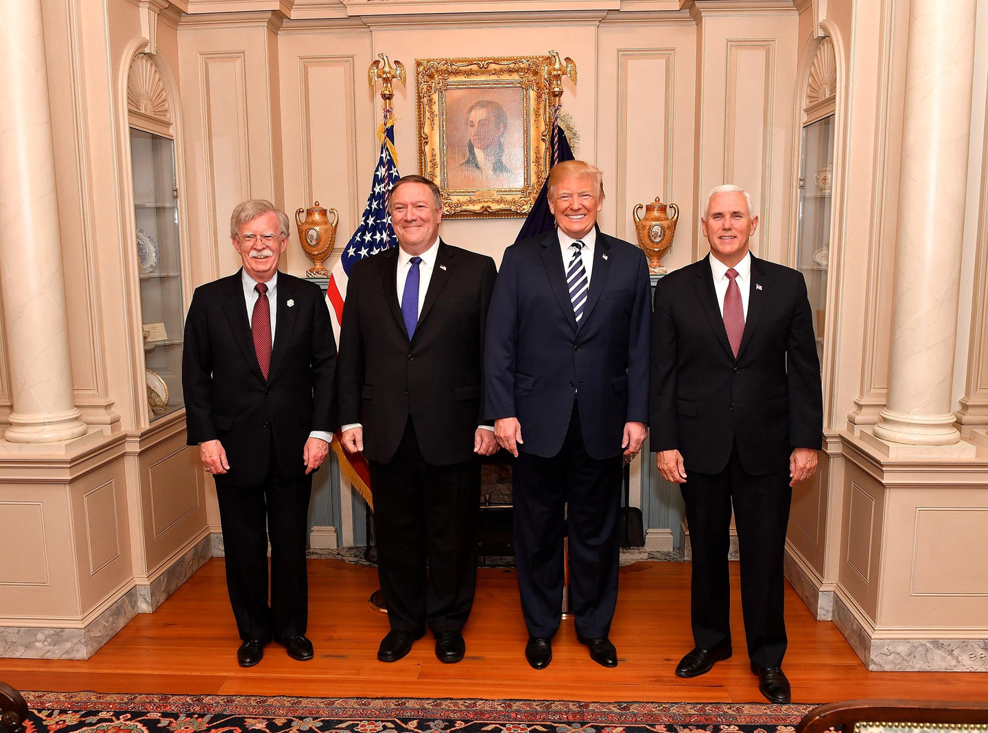 Trái qua: Cố vấn an ninh John Bolton, Ngoại trưởng Mike Pompeo, Tổng thống Donald Trump và Phó tổng thống Mike Pence trong một cuộc hội đàm. Ảnh: Bộ Ngoại giao Mỹ.