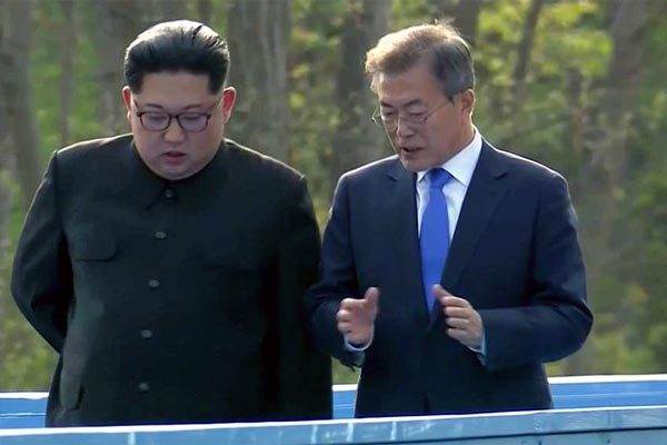 Ông Kim Jong Un (trái) và ông Moon Jae-in vừa đi vừa trò chuyện riêng ở Panmunjeom khi gặp thượng đỉnh hồi tháng 4/2018. Ảnh: Reuters