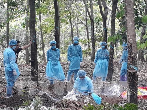 Cán bộ thú y chôn lấp lợn bệnh, phun thuốc khử trùng khu vực dịch.