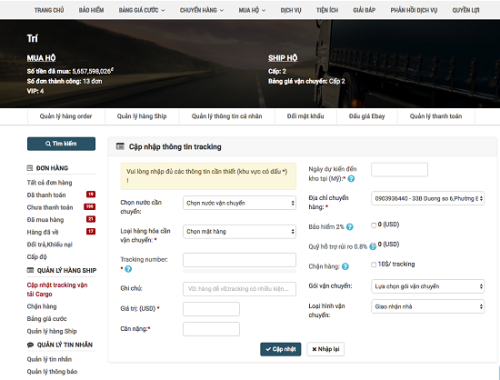 Sau khi nhận thông tin, website bán hàng thông báo đã gửi hàng cho bạn qua email. Bạn chỉ cần lấy thông tin mã vận đơn (tracking) của kiện hàng và tên hàng hóa, trị giá đặt đặt mua để khai vào vào tài khoản của của bạn trên Giaonhan247 như hình bên dưới.