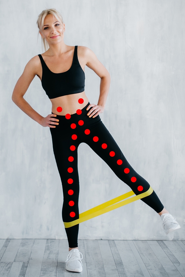 Đứng thẳng, dây kháng lực vòng hai qua bên bắp chân, hai tay chống hông. Nghiêng người, đá chân sang ngang 20 lần mỗi bên.