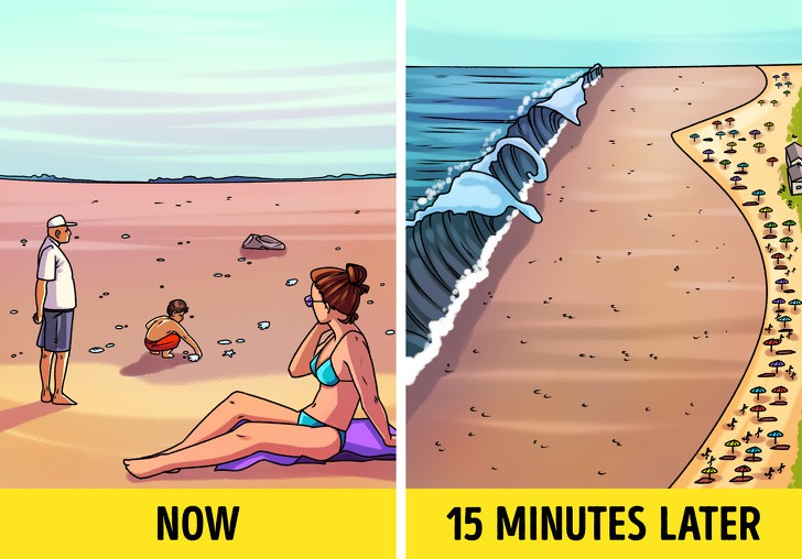Nếu nước biển đột nhiên rút xa bờ một cách bất thường, đó là dấu hiệu của sóng thần. Nếu nhận thấy điểm này, hãy nhanh chóng hô hoán, kêu gọi mọi người chạy trốn thật nhanh.