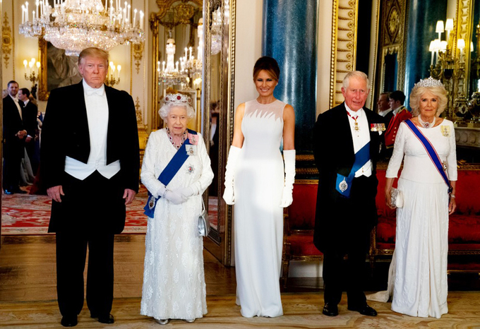 Tổng thống Trump và phu nhân Melania tối 3/6 dự tiệc chiêu đãi do Nữ hoàng Elizabeth chủ trì tại Cung điện Buckingham, khi khép lại ngày đầu tiên của chuyến thăm Anh. Ông di chuyển bằng trực thăng Marine One đến cung điện lúc gần 20h và bước vào phòng tiệc cùng Nữ hoàng, bà Melania và vợ chồng Thái tử Charles.