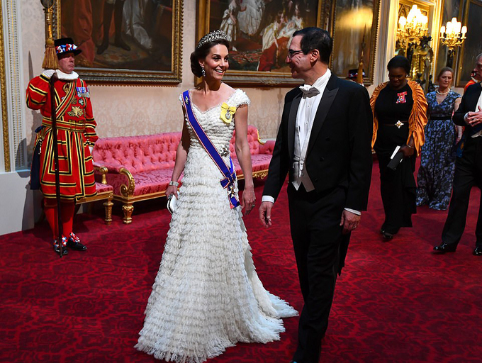 Có 16 thành viên hoàng gia Anh góp mặt tại quốc yến thết đãi Trump, trong đó có Công nương Kate. Cô đi vào phòng tiệc cùng Bộ trưởng Tài chính Mỹ Steven Mnuchin.