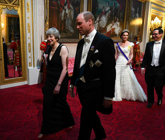 Hoàng tử William đi cạnh Thủ tướng Theresa May. Hoàng tử Harry, người trước đó ăn trưa cùng Trump, vắng mặt tại bữa tiệc. Công nương Meghan cũng không tham dự do bận chăm sóc con trai Archie mới sinh.