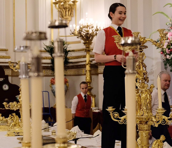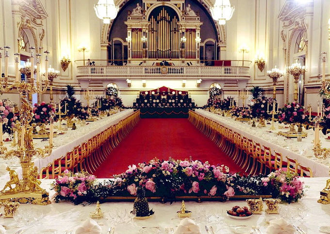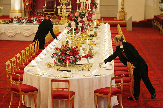 Mọi chi tiết trong phòng tiệc đều đòi hỏi sự tỉ mẩn. Các đĩa ăn được xếp cách nhau chính xác 18 inch (gần 46 cm), khoảng cách tính từ các ly đồ uống và ghế ngồi tới góc bàn cũng phải y hệt. Mỗi khách mời có 6 ly khác nhau dùng để uống nước, champagne, rượu vang đỏ và trắng, rượu vang tráng miệng và rượu pooctô.