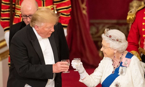 Tổng thống Trump (trái) nâng cốc cùng Nữ hoàng Anh Elizabeth trong quốc yến tổ chức tại Điện Buckingham, London, ngày 3/6. Ảnh: Reuters.